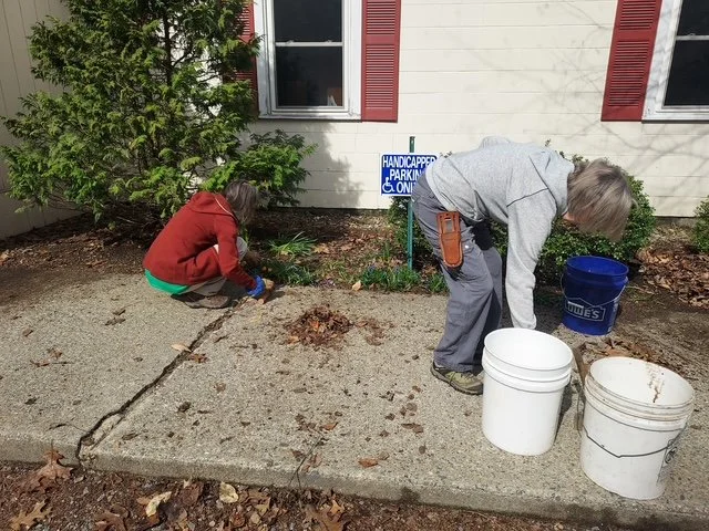 Even though there is room in both gardens for additional plants, we (Louise, Donna, Hilkka, Tina, Alice and Mike) decided that this week we should do a little spring cleaning around the Function Hall. The shrubs weathered the winter in good shape. Two low growing spring ephemeral flowers, pretty blue Siberian Squill (Scilla siberica) and tiny purple clusters of Grape Hyacinth added some nice color as they poked up through the matted leaves. Our removal of a great quantity of leaves gave them a little more “breathing room,” but also revealed spaces for additional colorful flowers. That will be our work for another week.